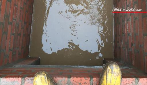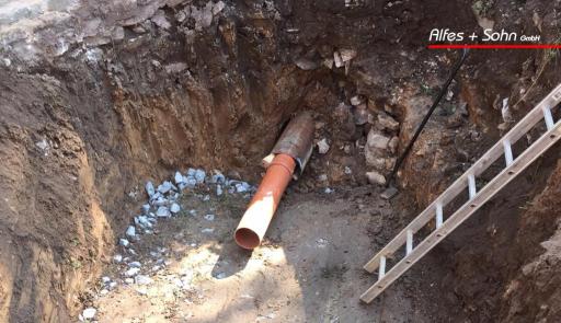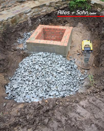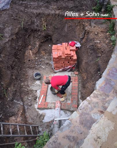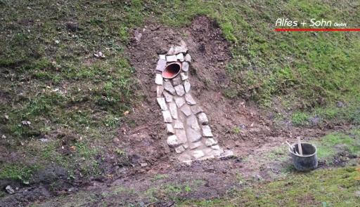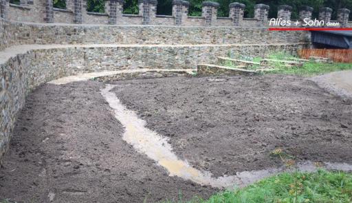 Auf den Bildern können Sie gut das angestaute Wasser innerhalb der Mauern sehen, welches wir mit einem kleinen Kanalsystem beseitigen konnten.
